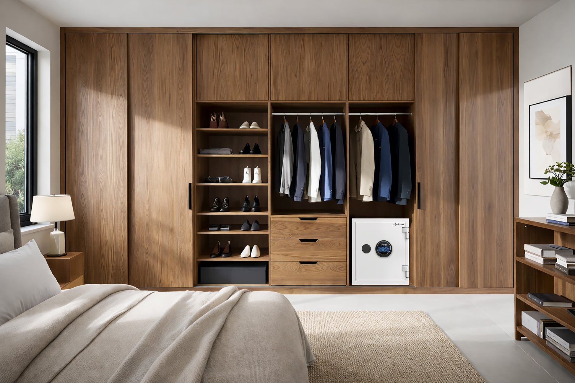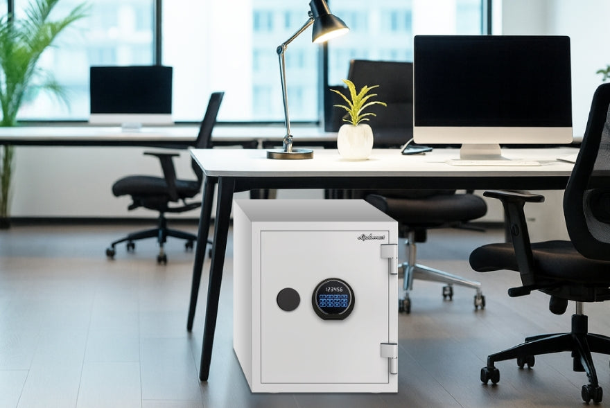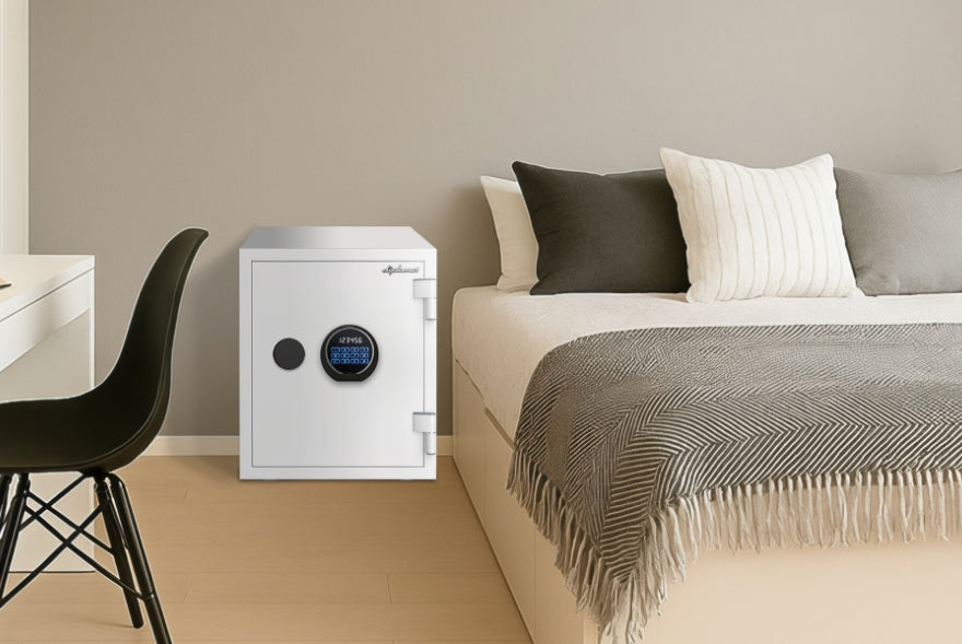 空間に馴染みやすいホワイトの佇まい。さまざまな防犯機能も充実した耐火・耐水金庫