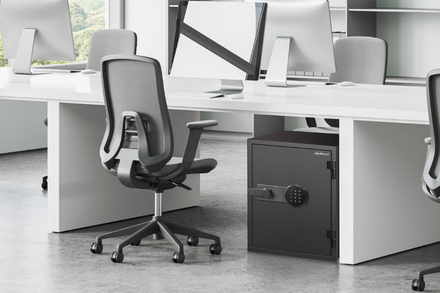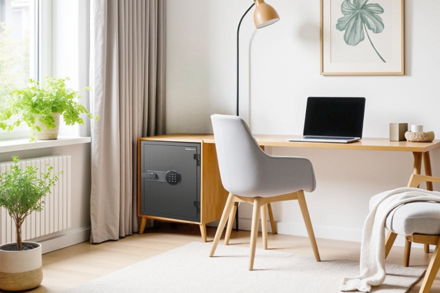 警報アラームなどの防犯機能も充実し、空間に溶け込む美しいオールブラックの耐火・耐水金庫